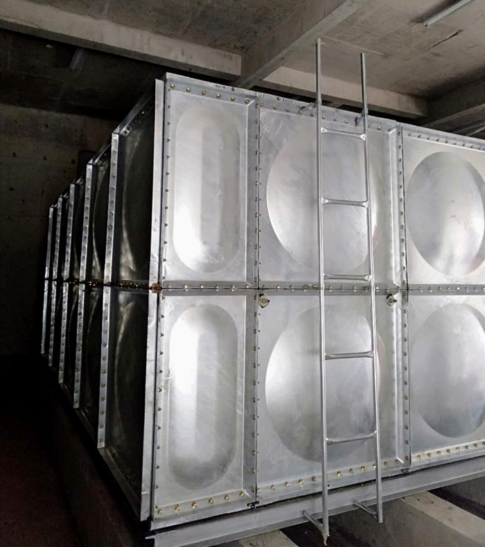 鍍鋅水箱主要采用優質的Q235鋼板沖壓而成,形成1000×1000、1000×500、500×500等標準板塊后經熱浸鍍鋅處理后形成鍍鋅水箱板。優點是:、全螺栓連接,現場進行組裝,組裝快捷方便,組裝時采用密封條密封,不易出現漏水及密封不嚴現象。第二、水箱體內特殊性拉桿結構,使力學性能更合理,高度可達到5米。鍍鋅水箱對安裝現場無特殊要求,無需吊裝設備,容積可滿足用戶要求。